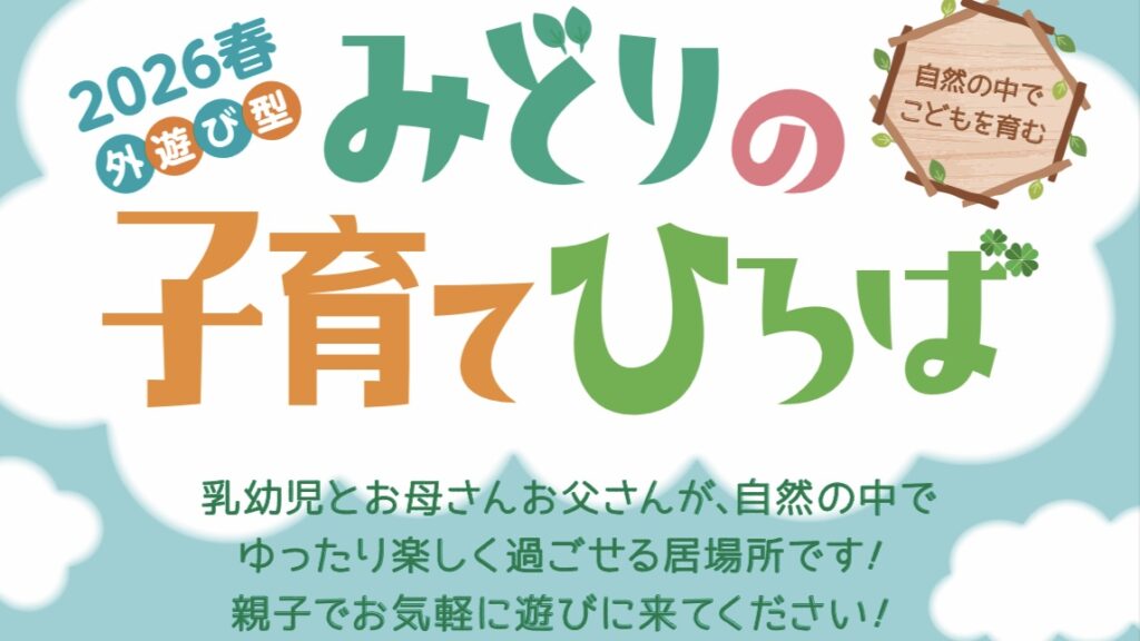 - 2026年度春の『みどりの子育てひろば』を開催します!お待たせしました!「みどりの子育てひろば」がこの春、再び開催となります。身近な自然と触れ合い、遊びながら、こどもたちののびのびした育ちを… 続きを読む: 2026年度春の『みどりの子育てひろば』を開催します!