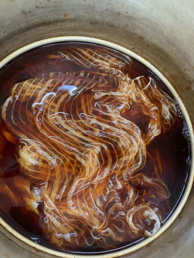 桜の小枝とウッドチップで染料をつくり、シルクコットンのストールを染めます。